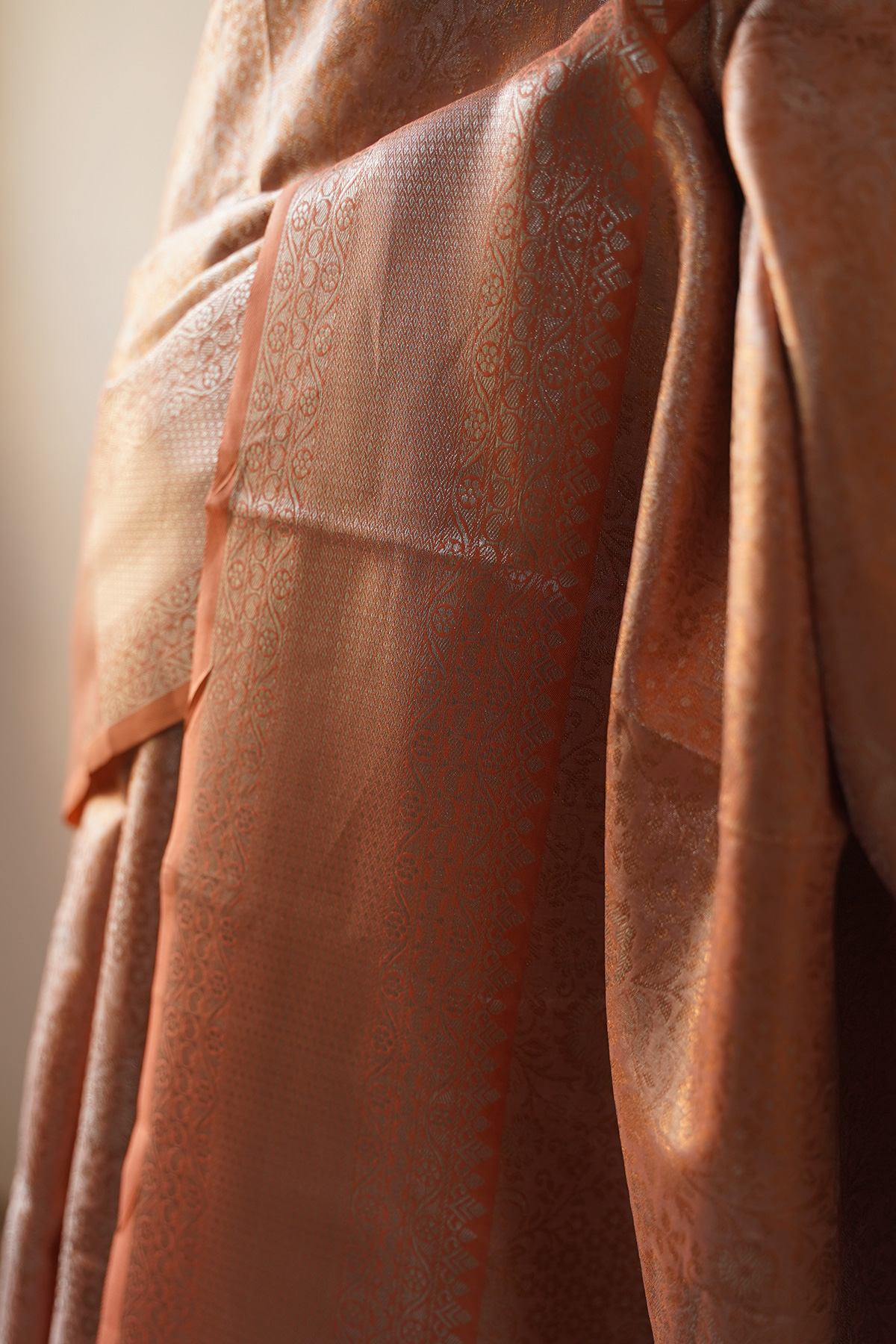 This copper tone saree is a perfect blend of sophistication and simplicity. Its smooth texture and elegant finish make it an ideal choice for women who prefer understated fashion. The subtle sheen enhances its premium feel, making it suitable for formal events, office functions, and evening parties. Designed to provide comfort along with style, this saree drapes beautifully and gives you a polished and confident look throughout the day.