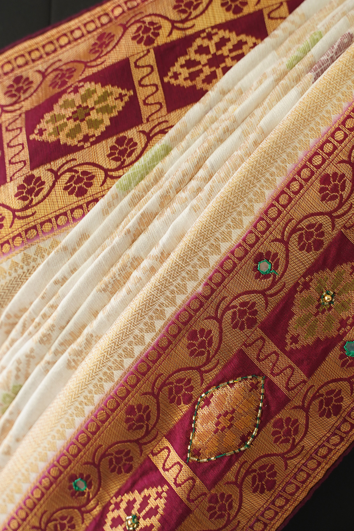 This cream texture saree exudes richness and sophistication, making it a standout piece in any wardrobe. The deep color on pallu adds a touch of luxury, while the elegant drape ensures a flattering fit. Ideal for evening functions, parties, and celebrations, this saree allows you to make a confident style statement. Pair it with silver or diamond jewelry for a glamorous and refined look.