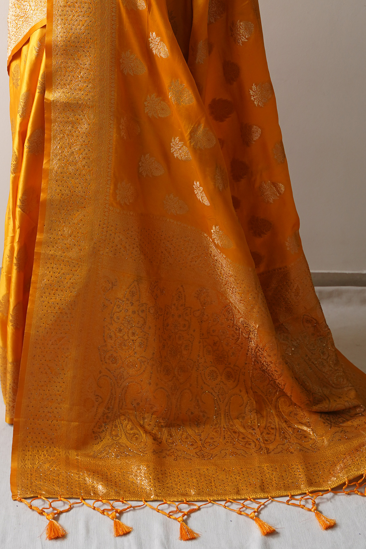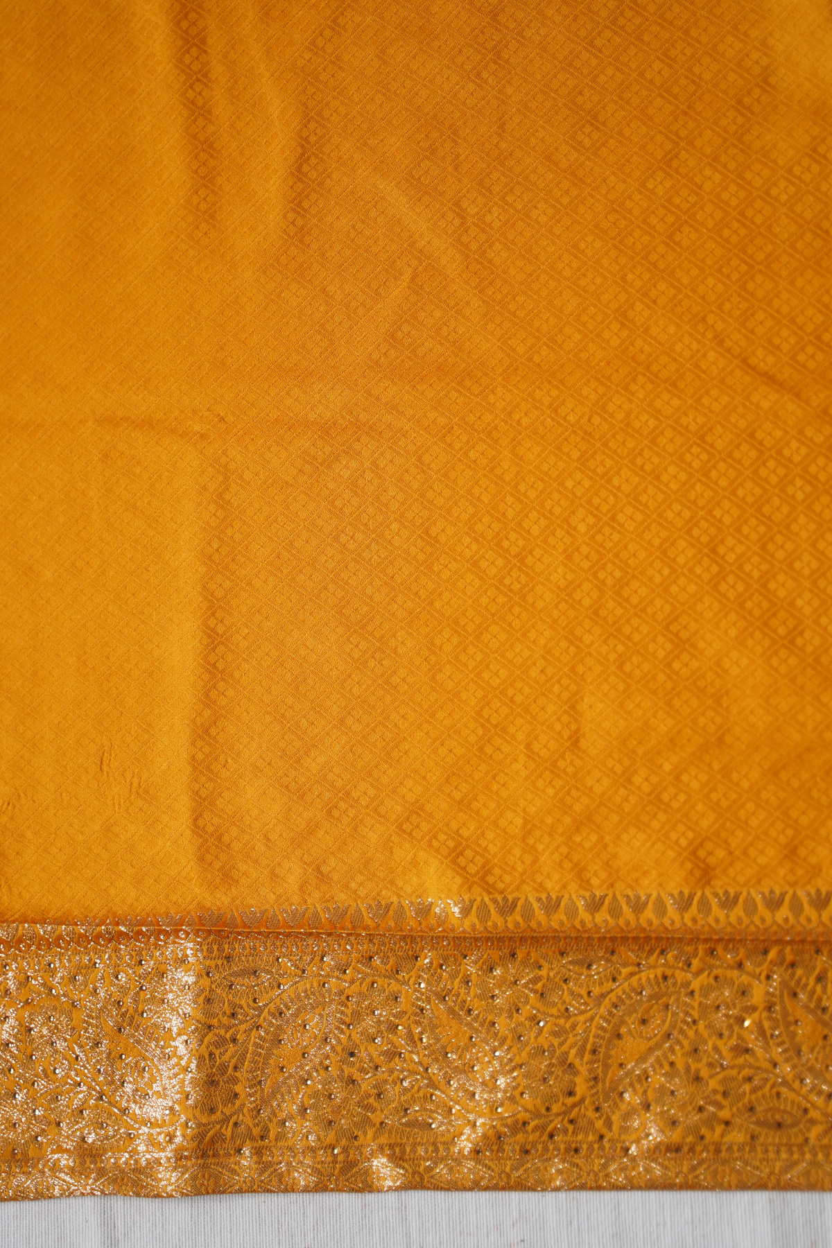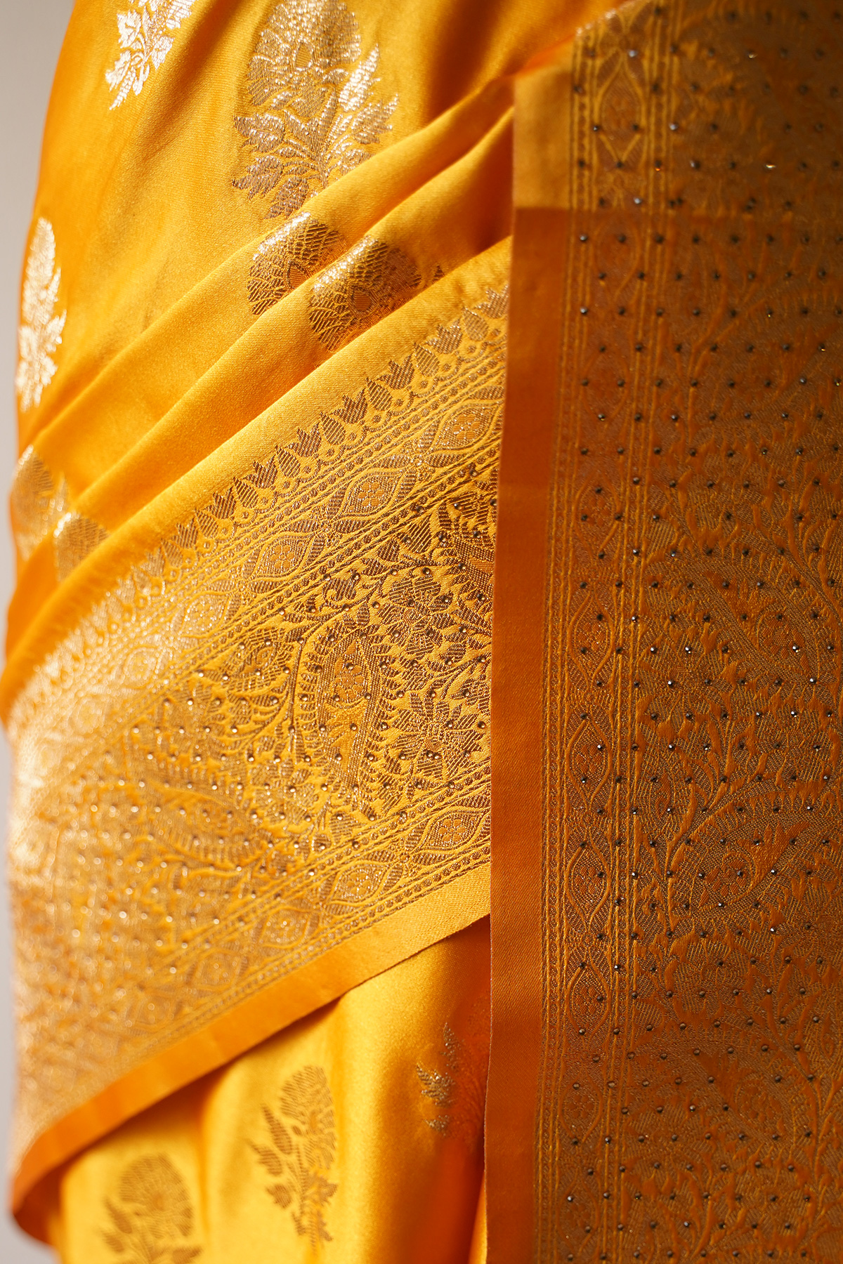 This golden yellow saree is designed for elegance and sophistication. Its subtle tone combined with a rich finish makes it ideal for weddings, receptions, and formal gatherings. The saree drapes beautifully, enhancing your overall appearance with a touch of luxury. Pair it with traditional or modern jewelry for a complete and polished look.