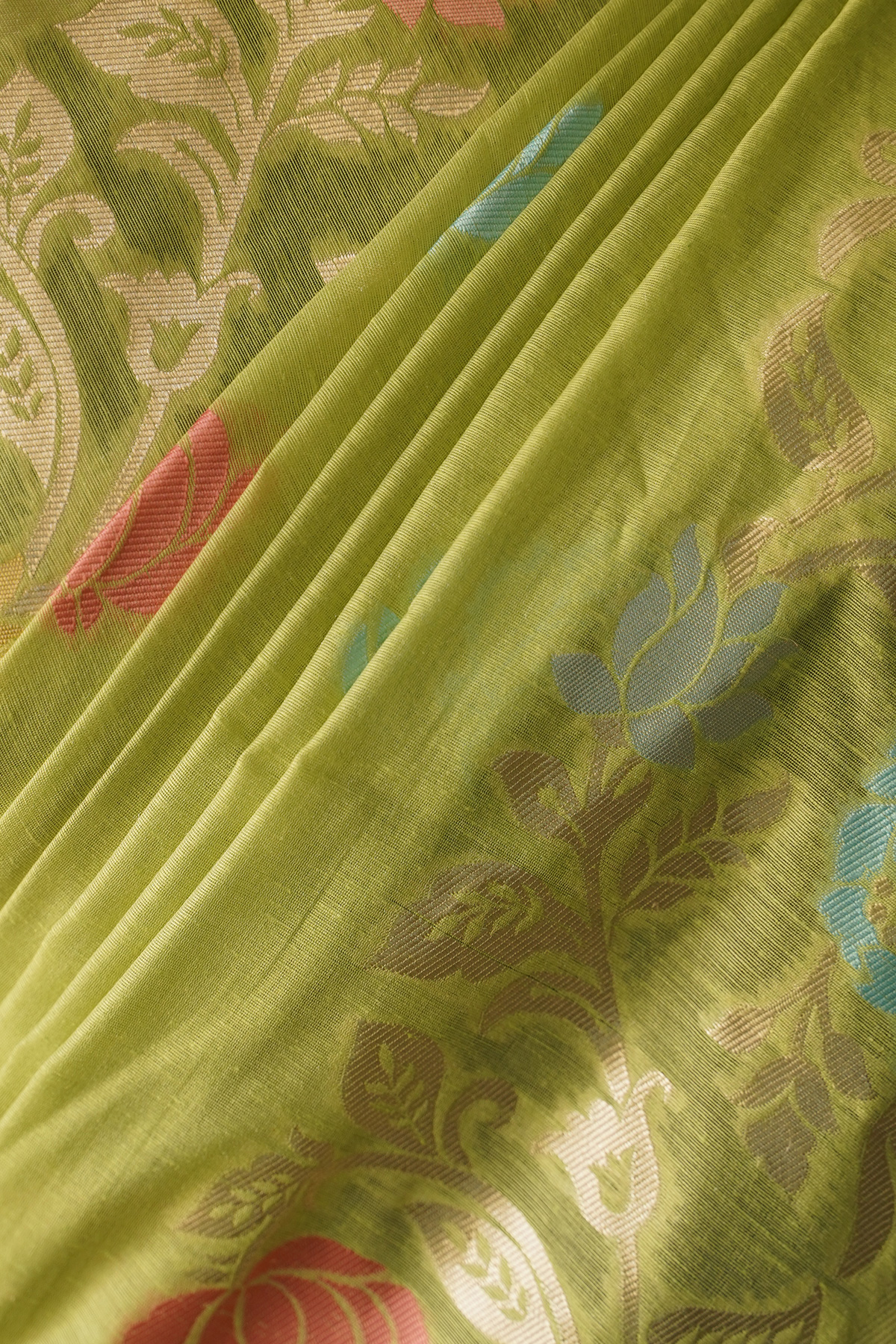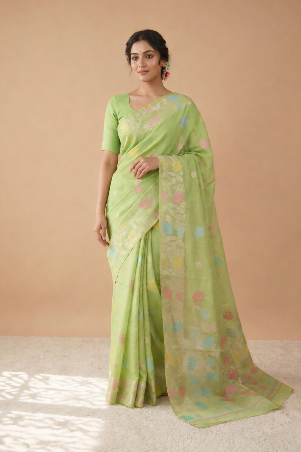 This light green saree is designed with elegant floral patterns that bring a fresh and lively vibe to your look. Its soothing color and lightweight feel make it perfect for summer days, casual gatherings, and daytime events. The breathable fabric ensures comfort while maintaining style, making it an ideal everyday ethnic wear option. Pair it with minimal accessories for a soft, elegant, and effortless appearance.