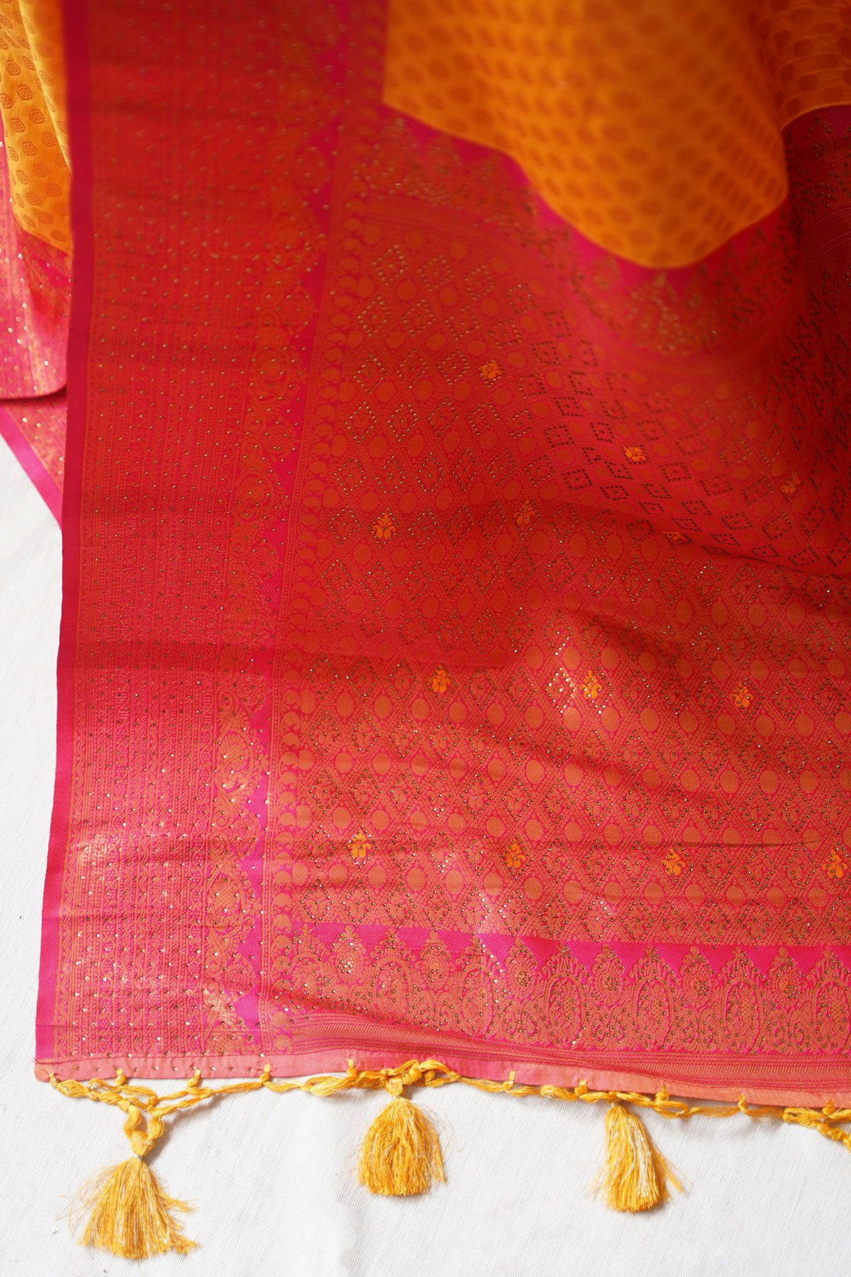 This stunning yellow saree is beautifully complemented with a bold red border and pallu, making it a timeless addition to your ethnic wardrobe. The vibrant color combination reflects traditional Indian aesthetics while ensuring you stand out in every celebration. Crafted for comfort and graceful draping, it is ideal for long festive days, religious functions, and special family occasions. Pair it with traditional jewelry to complete a classic and elegant look that never goes out of style.